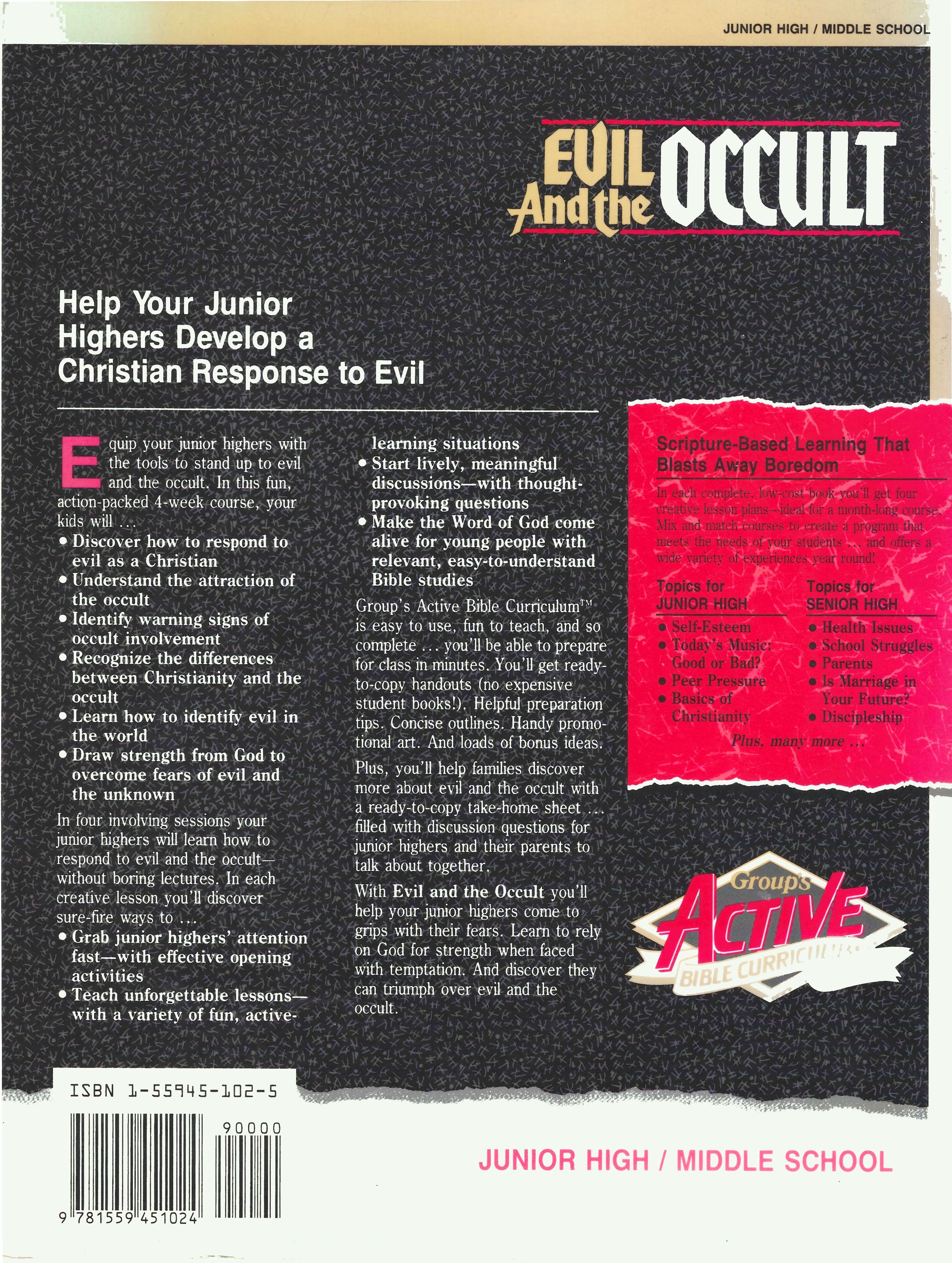 Evil and the Occult is a workbook for a 4-week course intended to put junior high school students on the right path and warn them of the dangers of evil practices such as listening to heavy metal music. Like others from the same publisher, it promises “Scripture-Based Learning That Blasts Away Boredom”, using the technique of distracting youngsters by making them participate in a series of inane exercises, each supposed to convey a lead-footed moral lesson. The job of the teacher is not to encourage free thinking, but instead to guide pupils to a predetermined conclusion, that conclusion being that certain things are inherently satanic, opposed to Christianity and hence BAD.
